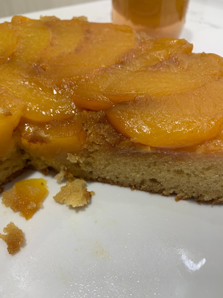 - Melt 1 1/2 tablespoons unsalted butter in a small pan and stir in the 1/4 cup sugar until melted. When it just starts to color, add a tablespoon of the peach liquid, and cook until just amber in color. Cool slightly, and when still pourable, pour caramel over the peach slices. Don’t worry if the caramel hardens, it will melt when the cake is baking.
